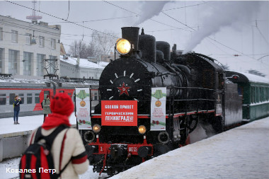 В честь этого события к платформе Финляндского вокзала подошел уникальный ретросостав: он почти такой же, как и тот, который пришел в Ленинград в 1943 году.