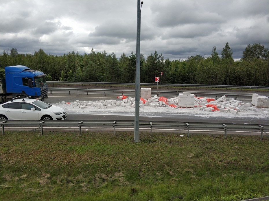 В Петербурге днем в субботу, 7 июля, съезд на КАД блокировали выпавшие из фуры блоки. Инцидент произошёл на съезде с Выборгского шоссе на КАД. ПО словам очевидцев в группе «ДТП и ЧП Санкт-Петербург» в настоящее время проезд осуществляется по одной полосе. По данным сервиса «Яндекс.Пробки», авария не помешала движению транспорта на развязке, скорость движения – 70 км в час. Сведений о пострадавшие в экстренные городские службы не поступало. По словам очевидцев, большегруз занесло на повороте и незакрепленные блоки вывалились на трассу.