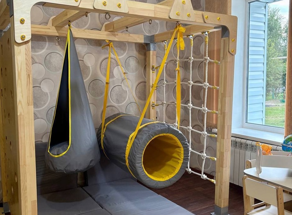 Оборудование подходит для различных обучающих и развивающих игр, безопасно для использования детьми: имеет скругленные углы, дополнено мягкими матами, а дверцы шкафов закрываются на ключ.