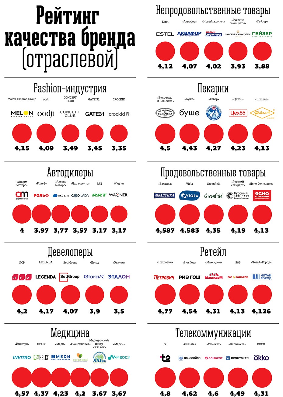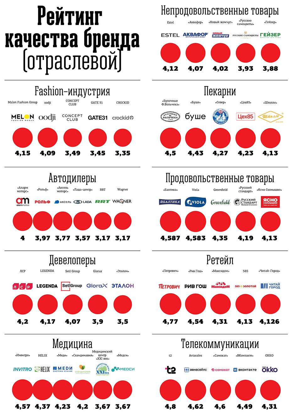 Рейтинг качества бренда отражает оценку усилий компаний в работе со своим брендом. Эксперты рассматривают такие показатели, как узнаваемость, качество айдентики, консистентность. Каждый из них оценивается по 5–балльной шкале. Итоговый балл определяет место бренда в отраслевой пятёрке.