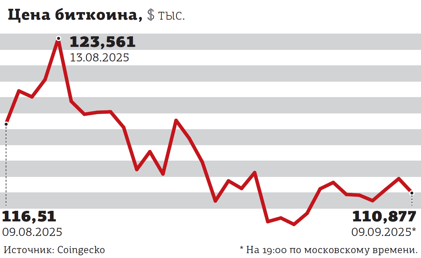Цена биткоина за тот же период уменьшилась на 0,3%, до $110,877 тыс. Эфир за 7 дней подешевел на 0,1%, до $4288,76. В лидерах роста среди первой десятки самых капитализированных криптовалют оказались риппл (+4,1%), солана (+4,9%) и догкоин (+12,1%).