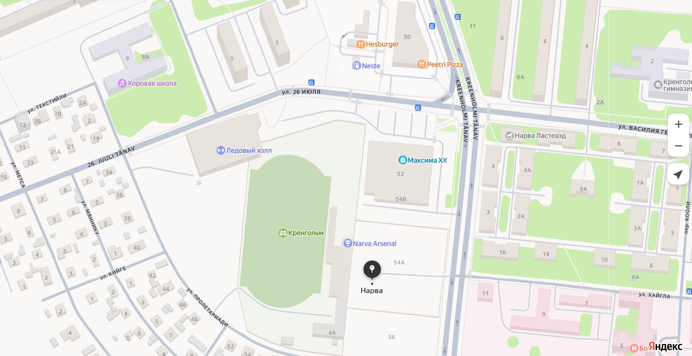 Речь идёт о пустыре, который находится в Нарве по адресу: улица Креенхольми, 54A. Рядом располагаются продуктовый гипермаркет Maxima XX и стадион "Кренгольм".