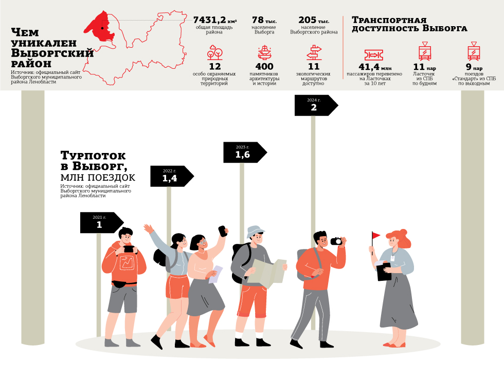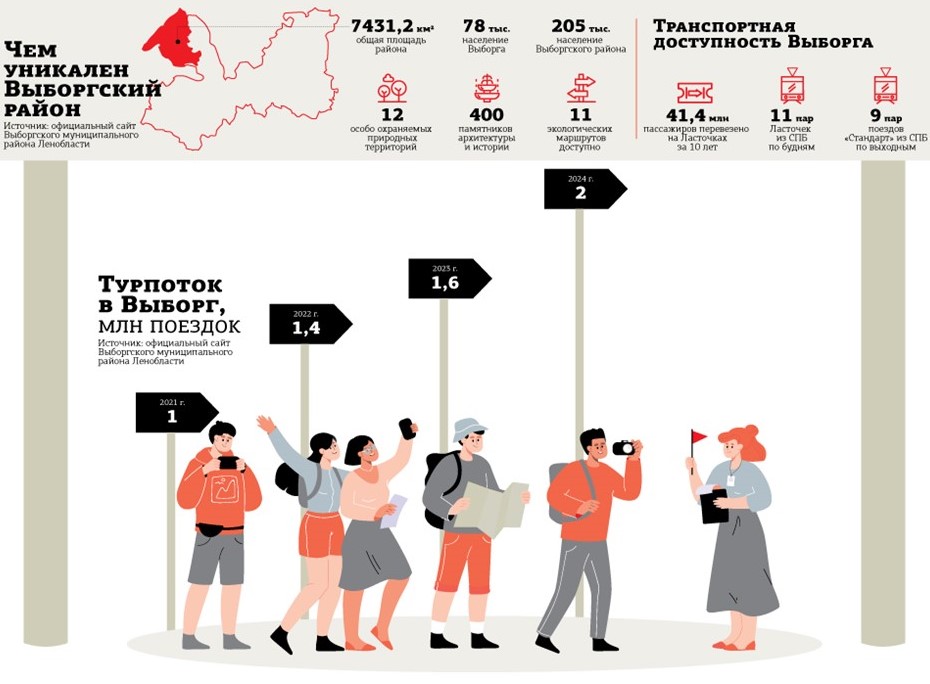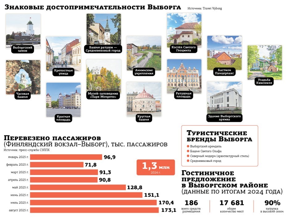 По итогам января–июня 2025 года Выборг уже посетили более 1 млн туристов и экскурсантов. Мы ожидаем, что по итогам года общий турпоток будет ещё на 20–25% больше. В город прибывают как электрички, так и экскурсионные автобусы, также многие приезжают на личных автомобилях. В тёплое время года город могут за день посещать предположительно около 4 тыс. туристов и экскурсантов. Доминируют в потоке экскурсанты, которые приезжают на 1 день. С этого года в Выборгском районе введён туристический налог, его платят только классифицированные средства размещения, прошедшие самооценку. Прогнозируется, что налог будет приносить в бюджет города несколько десятков миллионов рублей. Активность туристов — драйвер развития инфраструктуры. За последний год открылись две гостиницы, недавно был выкуплен Гранитный дворец (дворец Хакмана), в котором также планируется отель. В высокий сезон, особенно в дни проведения фестивалей, средств размещения не хватает, поэтому новые проекты нужны городу. Появляются новые точки притяжения, например в ближайшее время откроется обновлённая Петровская набережная, которая станет местом проведения мероприятий и экскурсий. За последние годы прошла реставрация парка "Монрепо", Выборгского замка, здания Ратуши. Есть масштабный проект по реставрации исторического квартала Сета Солберга, ожидаем, что в следующем году работы начнутся.