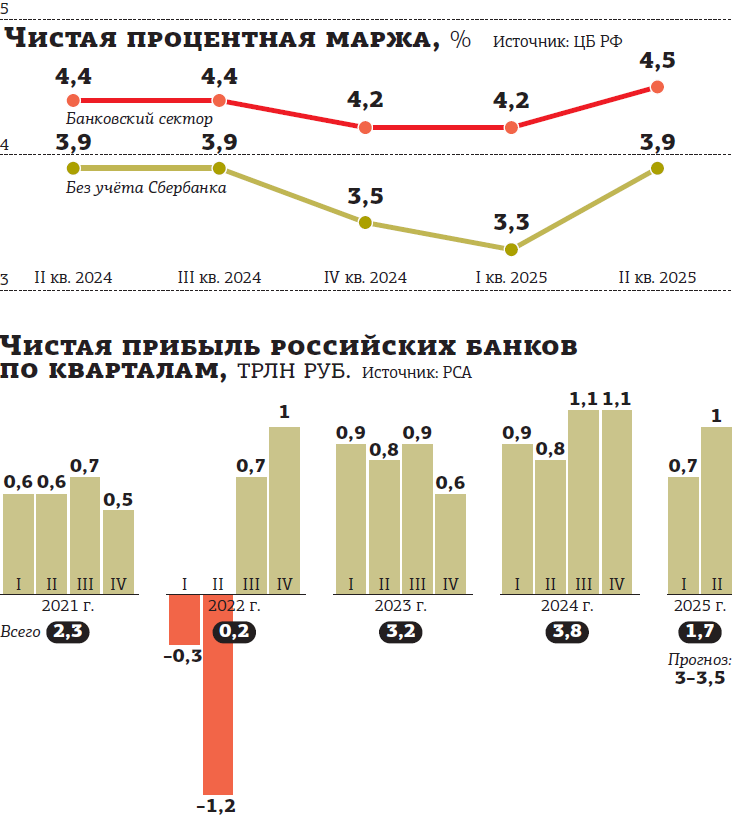 ЦБ сохраняет прогноз чистой процентной маржи в диапазоне 4–4,4% по итогам 2025 года, ожидая, что она будет ближе к его верхней границе. А что касается чистой прибыли, то банки вполне могут повторить рекорд прошлого года, заработав 3–3,5 трлн рублей, прогнозирует регулятор.