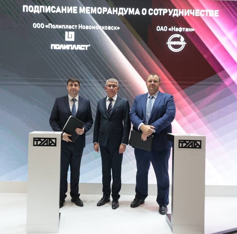 Важной частью работы Компании на выставке стало подписание соглашения о намерениях по международному сотрудничеству между флагманским заводом ГК "Полипласт" ООО "Полипласт Новомосковск" и одним из крупнейших нефтеперерабатывающих предприятий Белоруссии ОАО "Нафтан", при поддержке Минпромторга России, Минпромторга Республики Беларусь, Государственного военно-промышленного комитета Республики Беларусь и Правительства Тульской области. Почетным гостем церемонии подписания, которая проходила на стенде региона, стал губернатор Тульской области Дмитрий Миляев.