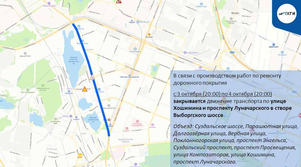 В этот раз на сутки закрывается проезд по улице Хошимина и проспекту Луначарского в створе Выборгского шоссе:
