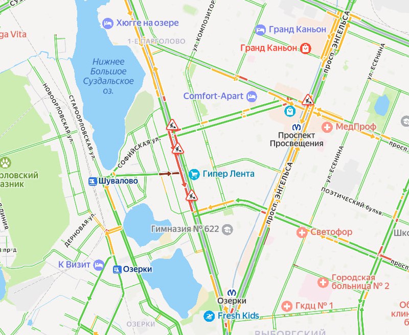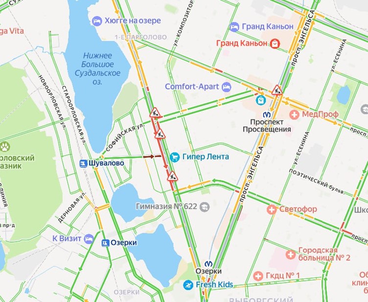 Больше всего пробок снова ожидается в Выборгском районе из-за ремонта главной магистрали. Помимо самого Выборгского шоссе для водителей перекрывают перекрёстки с прилегающими улицами.