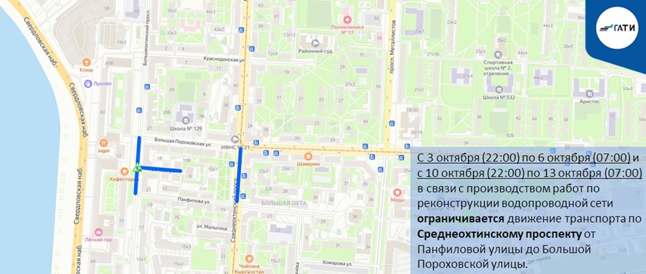 "Ограничения коснутся Среднеохтинского пр. от Панфиловой ул. до Большой Пороховской ул. на срок с 03.10.2025 по 06.10.2025 и с 10.10.2025 по 13.10.2025. Других ограничений пока не планируется", — уточнили "ДП" в пресс-службе "Водоканала".