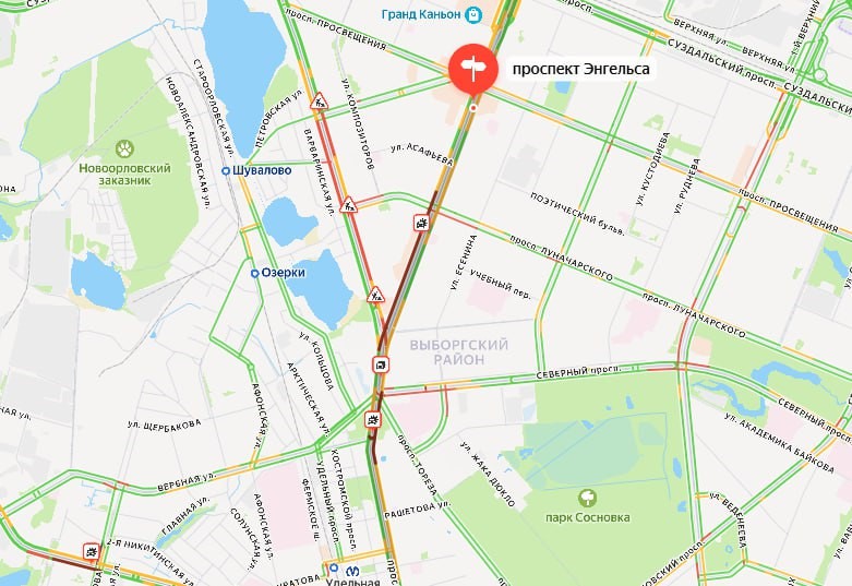К тому же ситуация осложняется дорожными работами у метро "Озерки" и дачи Лесснера. Также движение затруднено из-за ДТП у Поклонной горы, около пересечения Энгельса с проспектом Луначарского и пересечения Энгельса с улицей Асафьева.