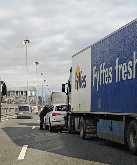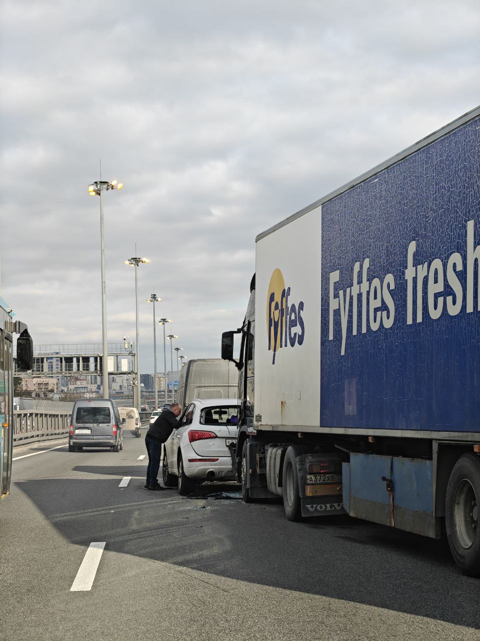 Судя по опубликованным кадрам, в легковой автомобиль врезалась фура. У пострадавшего авто выбиты стёкла.