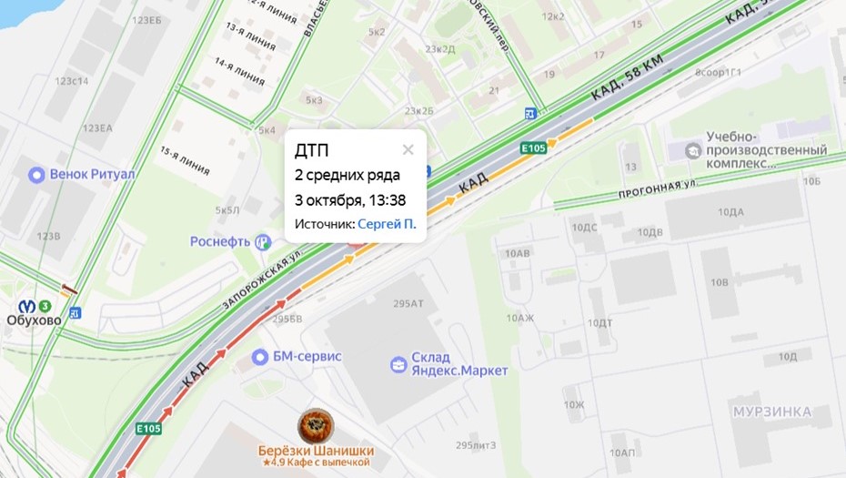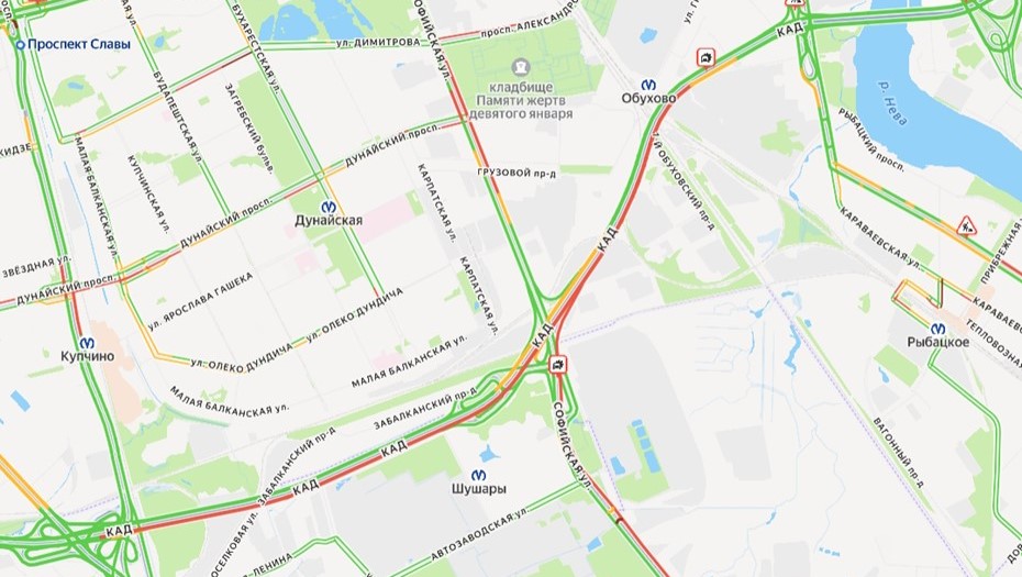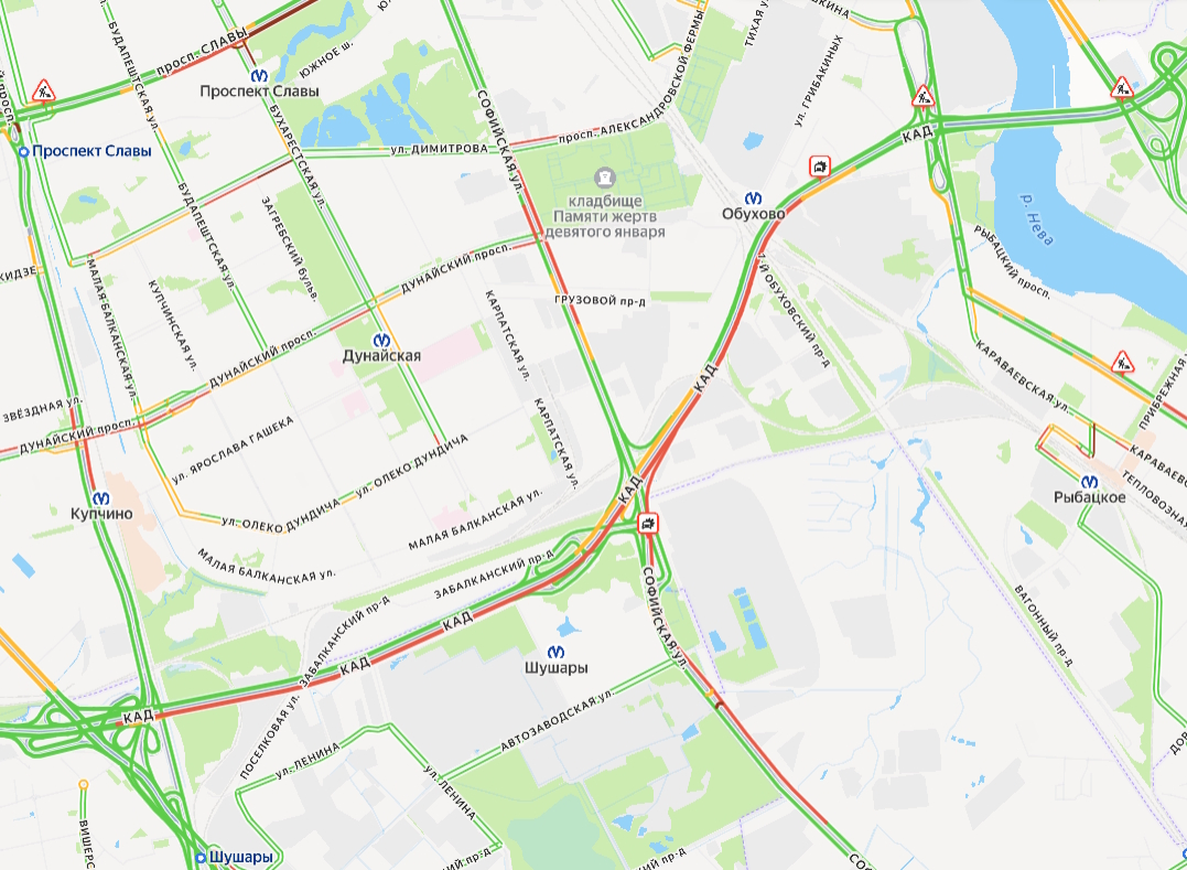 Пробка на кольцевой по состоянию на 15:05 мск фиксируется на участке от Витебского проспекта до проспекта Обуховской Обороны. Движение затруднено и по Софийской улице.