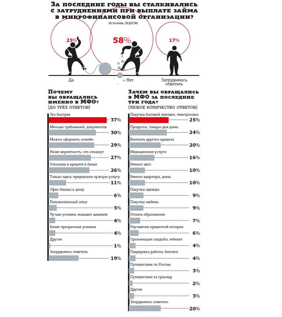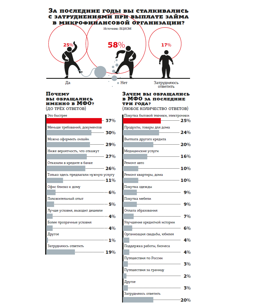 Россияне предпочитают брать кредиты в микрофинансовых организациях (МФО), так как считают, что это быстрее и удобнее, чем в банках, выяснили социологи ВЦИОМ. Как правило, деньги берут для покупки бытовой техники и электроники, товаров повседневной необходимости и, как ни печально, погашения кредитов, взятых ранее.
