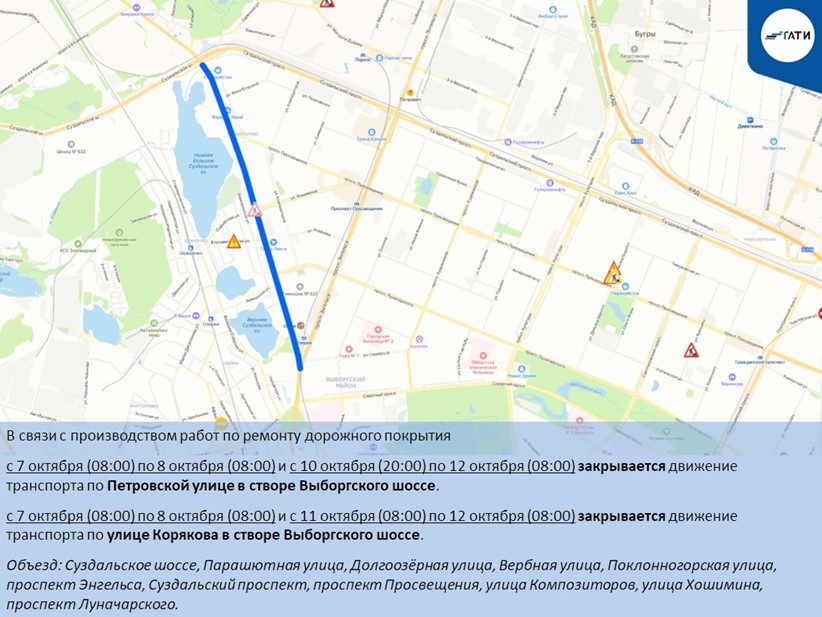 Выборгское шоссе и прилегающие улицы опять "притормозят" дорожные работы: закроют проезд на перекрёстках сразу с двумя из них.