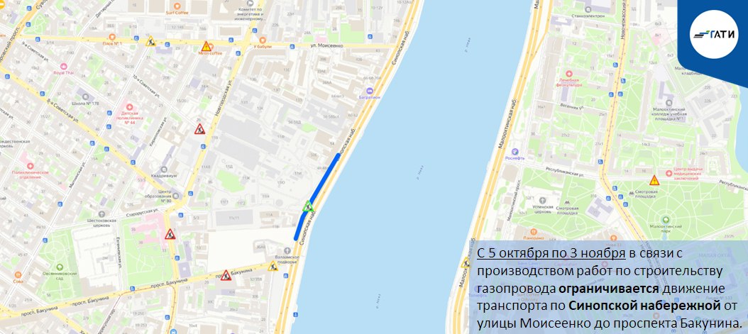 На Синопской набережной ООО "ПетербургГаз" продолжает строить газопровод. Проезд от улицы Моисеенко до проспекта Бакунина сузят почти на месяц, с 5 октября по 3 ноября.