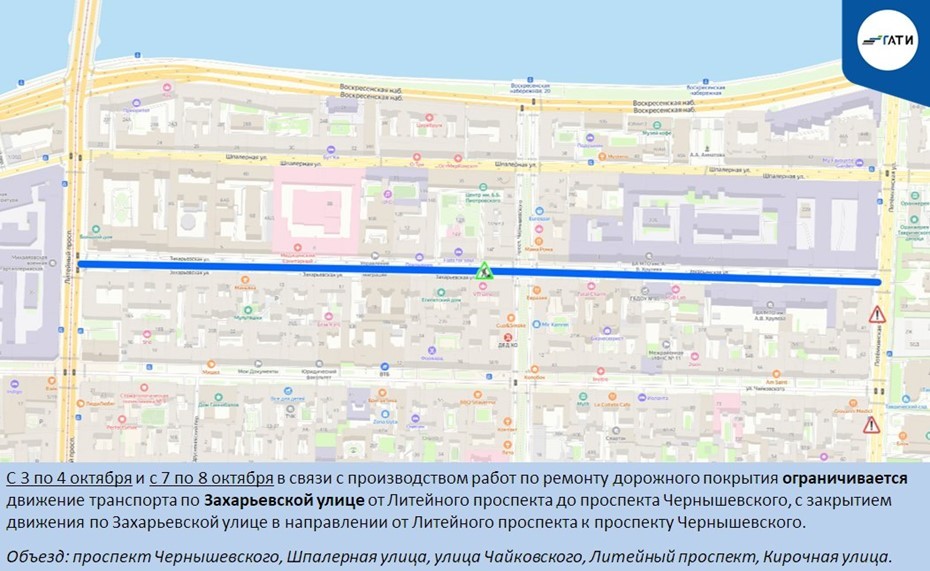 На Захарьевской улице до 30 ноября АО "ПО "Возрождение" ремонтирует асфальт. Из-за этого сначала с 3 по 4 октября, а затем с 7 по 8 октября закроют движение от Литейного проспекта в сторону проспекта Чернышевского.