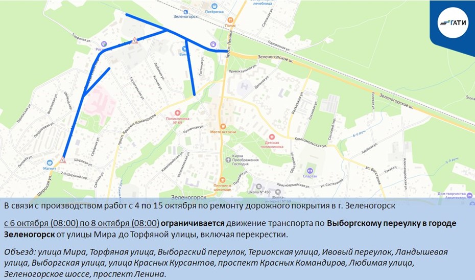 В Зеленогорске, как уже ранее писал "ДП", с 08:00 мск 6 октября по 08:00 мск 8 октября ограничат Выборгский переулок от улицы Мира до Торфяной улицы, включая перекрёстки.