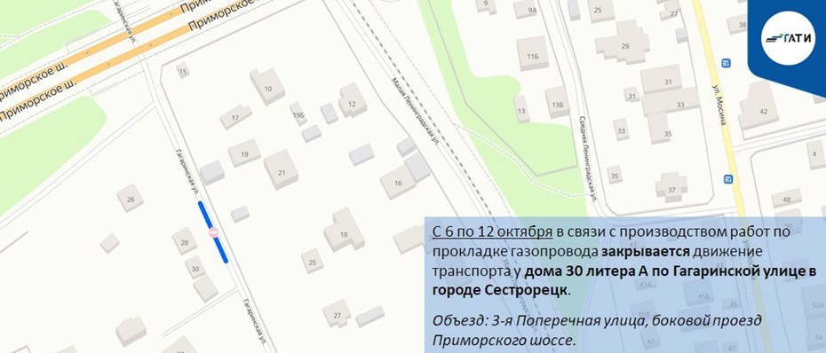С 6 по 12 октября из-за прокладки газопровода заблокируют проезд у дома №30, лит. А, по Гагаринской улице. Для объезда в Сестрорецке предлагают ехать по 3-й Поперечной улице и боковому проезду Приморского шоссе.
