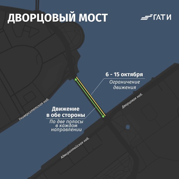 В ведомстве также напомнили о старте финального этапа ремонта Дворцового моста, который начнётся в понедельник. С 6 по 15 октября ограничат проезд в направлении от Дворцовой и Адмиралтейской набережных к Университетской набережной.