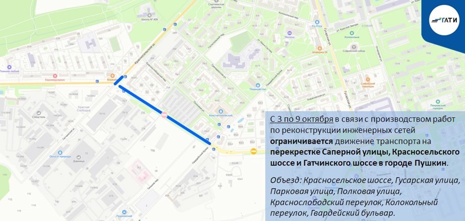 В Пушкинском районе продолжают прокладывать инженерные сети для будущего "ИТМО Хайпарка". Из-за этого с 3 по 9 октября ограничат один из въездов в Пушкин — перекрёсток Красносельского шоссе, Гатчинского шоссе и Сапёрной улицы.