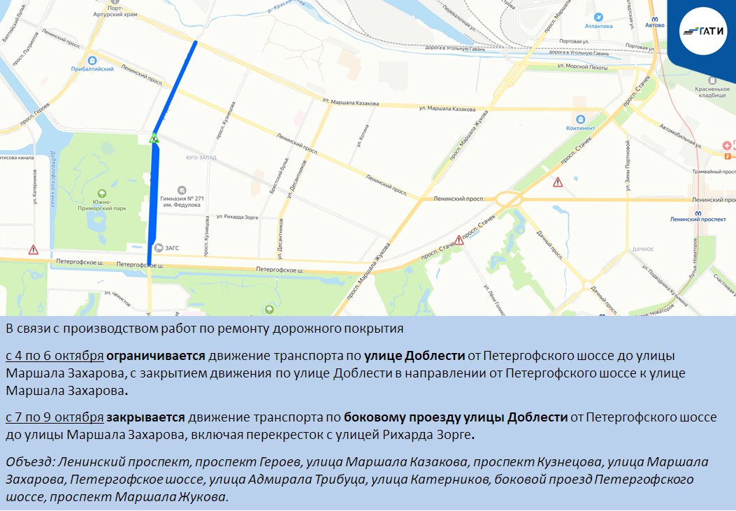 В Красносельском районе продолжают ремонтировать асфальт на улице Доблести. С 4 по 6 октября по ней закроют движение в направлении от Петергофского шоссе к улице Маршала Захарова.