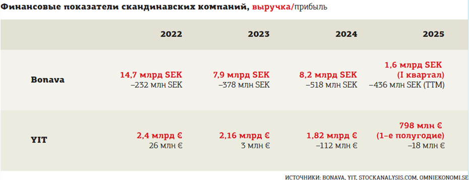 Согласно отчётности компаний, с 2022 года Bonava ежегодно недосчитывалась порядка 6–7 млрд шведских крон выручки (1 шведская крона — это чуть меньше 0,1 евро) и фиксировала убытки. Финская YIT за 2023–2024 годы потеряла около 600 млн евро выручки и из прибыльной компании превратилась в убыточную. В совокупности девелоперы лишились более 1,2 млрд евро доходов и понесли дополнительные убытки в размере около 164 млн евро.