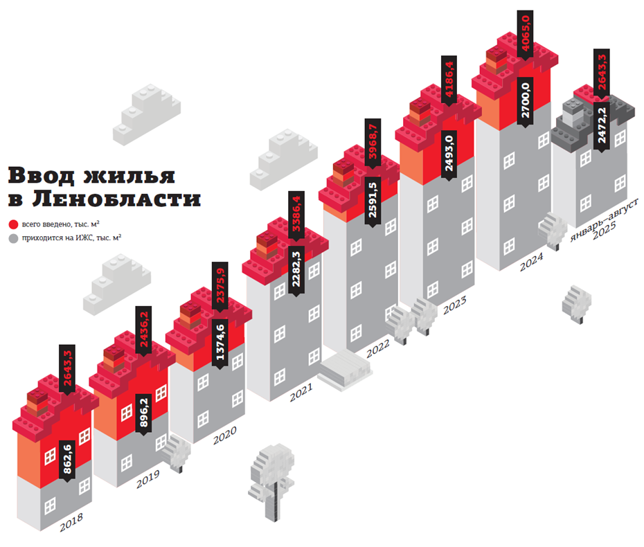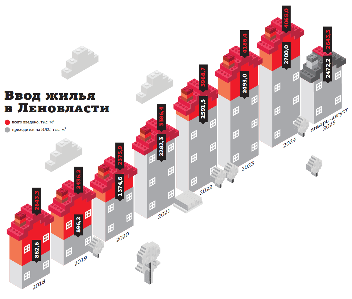 В Ленобласти удельный вес ИЖС также стабильно высок. Ещё в 2022 году доля нового жилья в частных домах достигла здесь 62,1%. По данным на январь–июль 2025–го, сектор ИЖС продолжает уверенно расти — введено 2,01 млн м2 частных домов, что на 12% больше, чем за аналогичный период прошлого года. Доля ИЖС составляет 78% от всего объёма жилья, построенного в области.