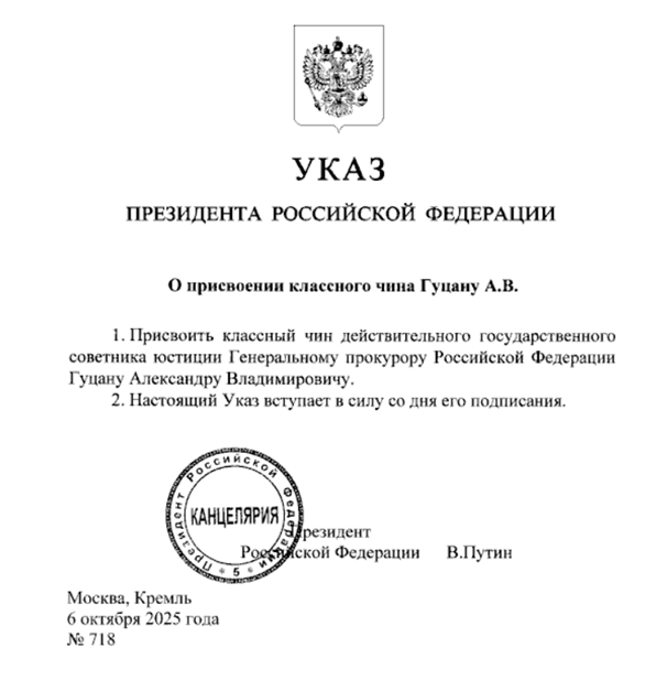 "Присвоить классный чин действительного государственного советника юстиции генеральному прокурору Российской Федерации Гуцану Александру Владимировичу", — сказано в документе.