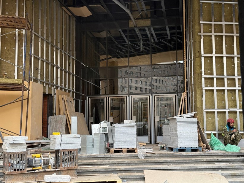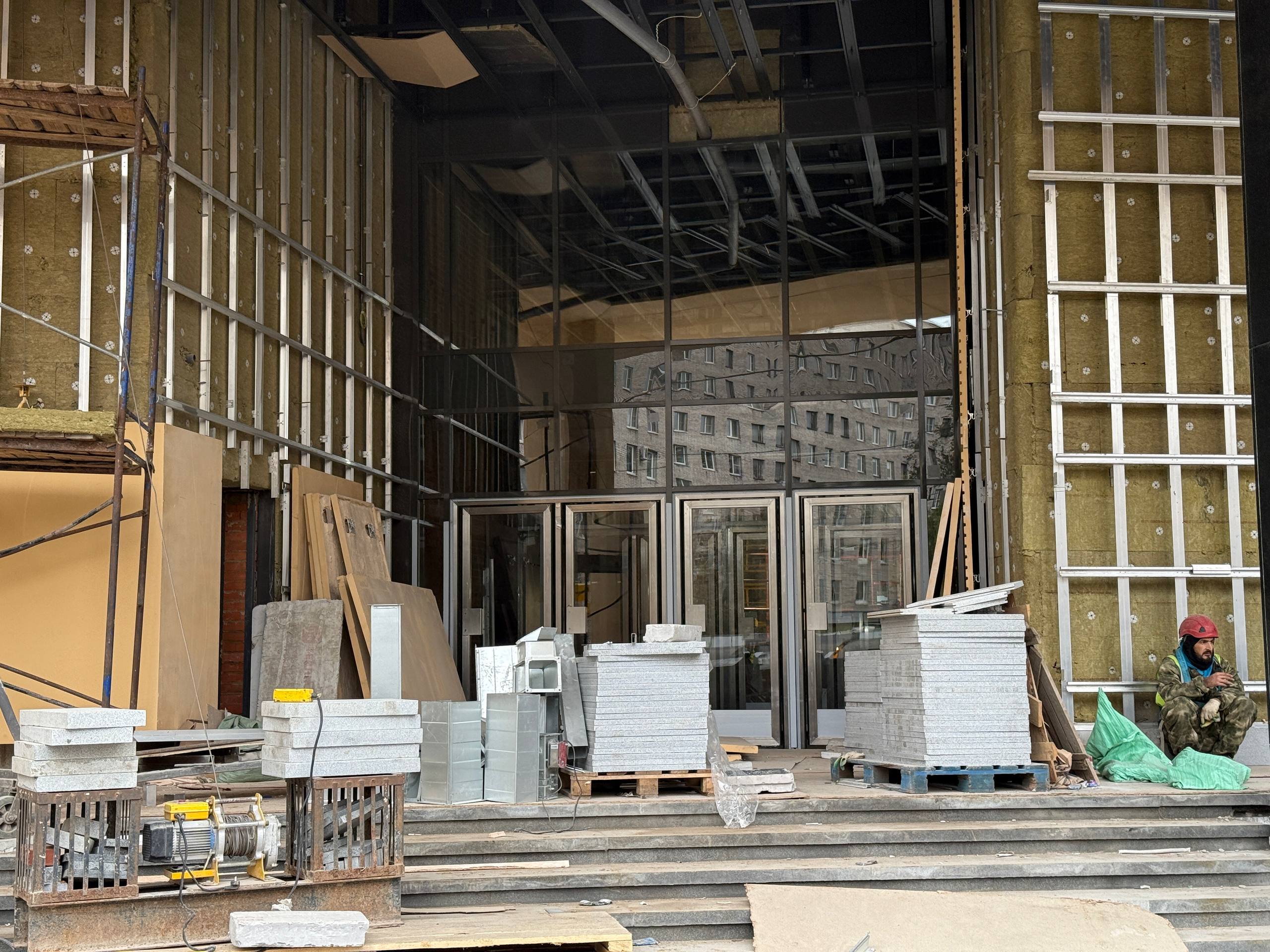 Завершён монтаж дверей во входных группах, ранее были установлены двери на выходах. В вестибюле также завершается установка стеклянных панелей.