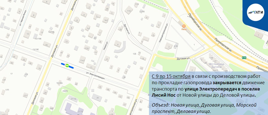 В посёлке Лисий Нос также прокладывают газопровод. Из-за этого в Приморском районе с 9 по 15 октября заблокируют проезд по улице Электропередач от Новой улицы до Деловой улицы.