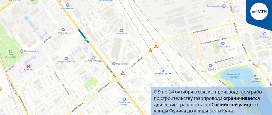 На Софийской улице ООО "ПетербургГаз" продолжает строить газопровод. С 9 по 14 октября во Фрунзенском районе ограничат проезд на участке от улицы Фучика до улицы Белы Куна.