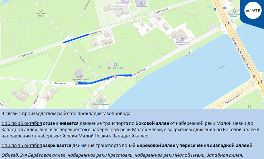 Из-за прокладки газопровода с 10 по 15 октября закроют проезд по 1-й Берёзовой аллее у пересечения с Западной аллеей. На тот же период заблокируют Боковую аллею в направлении от набережной реки Малой Невки к Западной аллее.