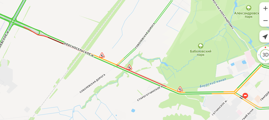 Пробки здесь наблюдаются и в настоящее время (10:45 мск. — Ред.). Участок Красносельского шоссе от Старогатчинского шоссе до Киевского шоссе в обе стороны краснеет и багровеет. Перекрёсток с Сапёрной улицей на онлайн-сервисе "Яндекс.Карты" отображается красным, а направление к паркам — жёлтым.