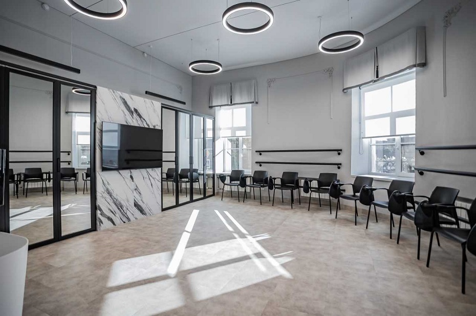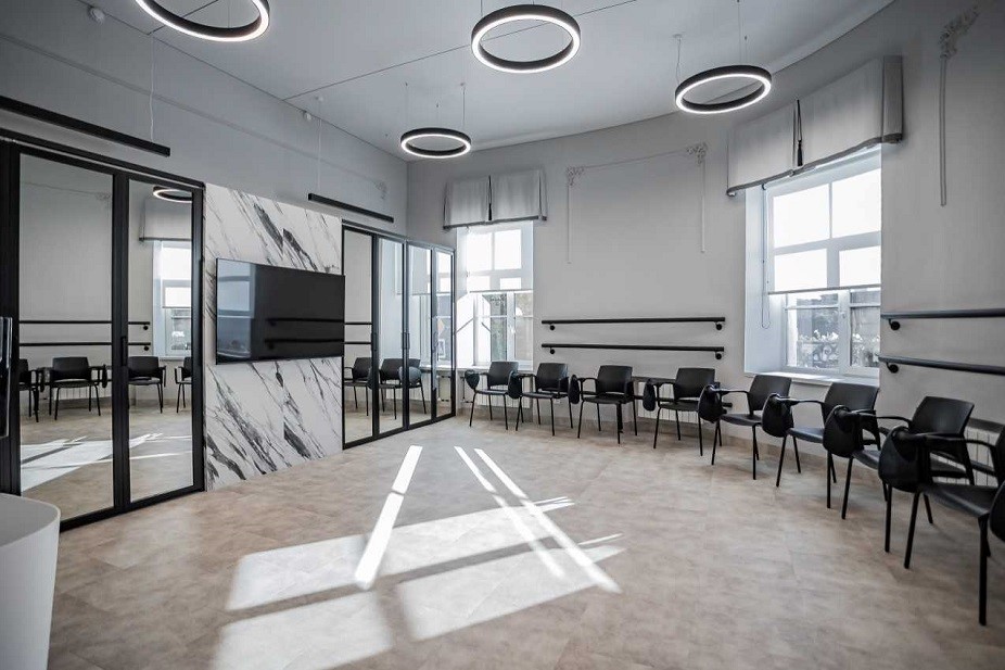 За время ремонта был обновлен дизайн всех помещений: процедурного и медицинских кабинетов, кабинетов УЗД, зала ЛФК, всех зон отдыха и общего пользования. Была отреставрирована парадная лестница, ведущая на второй этаж в Центр гинекологии и акушерства.