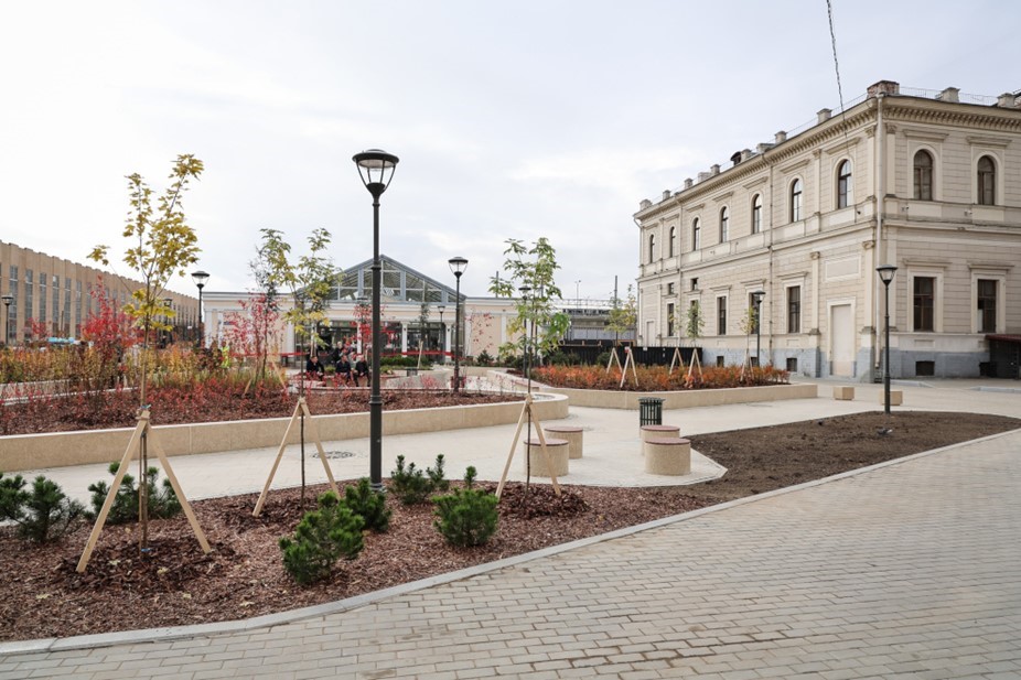Новое общественное пространство призвано обеспечить комфортный транзит и предоставить возможности для отдыха. Ключевым элементом сквера стал памятный знак, посвящённый истории развития железнодорожного сообщения в России.