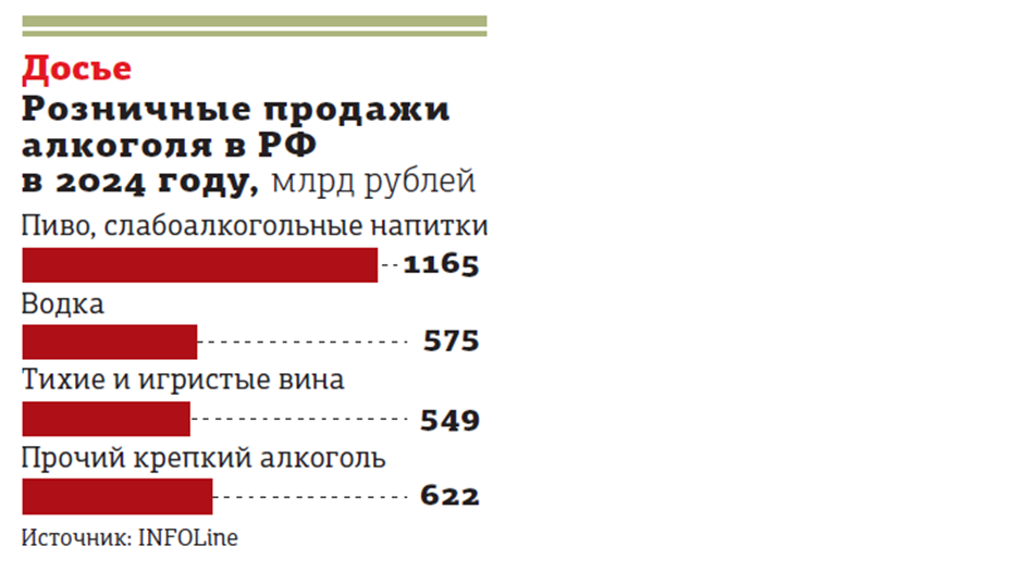 Розничные продажи алкоголя в России по итогам 2025 года могут вырасти на 13,1%, до 3,3 трлн рублей. В том числе продажи вина могут показать рост на 14,7%, до 0,63 трлн рублей; крепкого алкоголя (без водки) — на 17,2%, до 0,73 трлн; пива и слабоалкогольных напитков — на 11,7%, до 1,3 трлн. Такими прогнозами поделились аналитики агентства INFOLine. Они ожидают, что в 2025–2029 годах рынок в целом будет расти в среднем на 10,8% в год и достигнет 4,9 трлн рублей.
