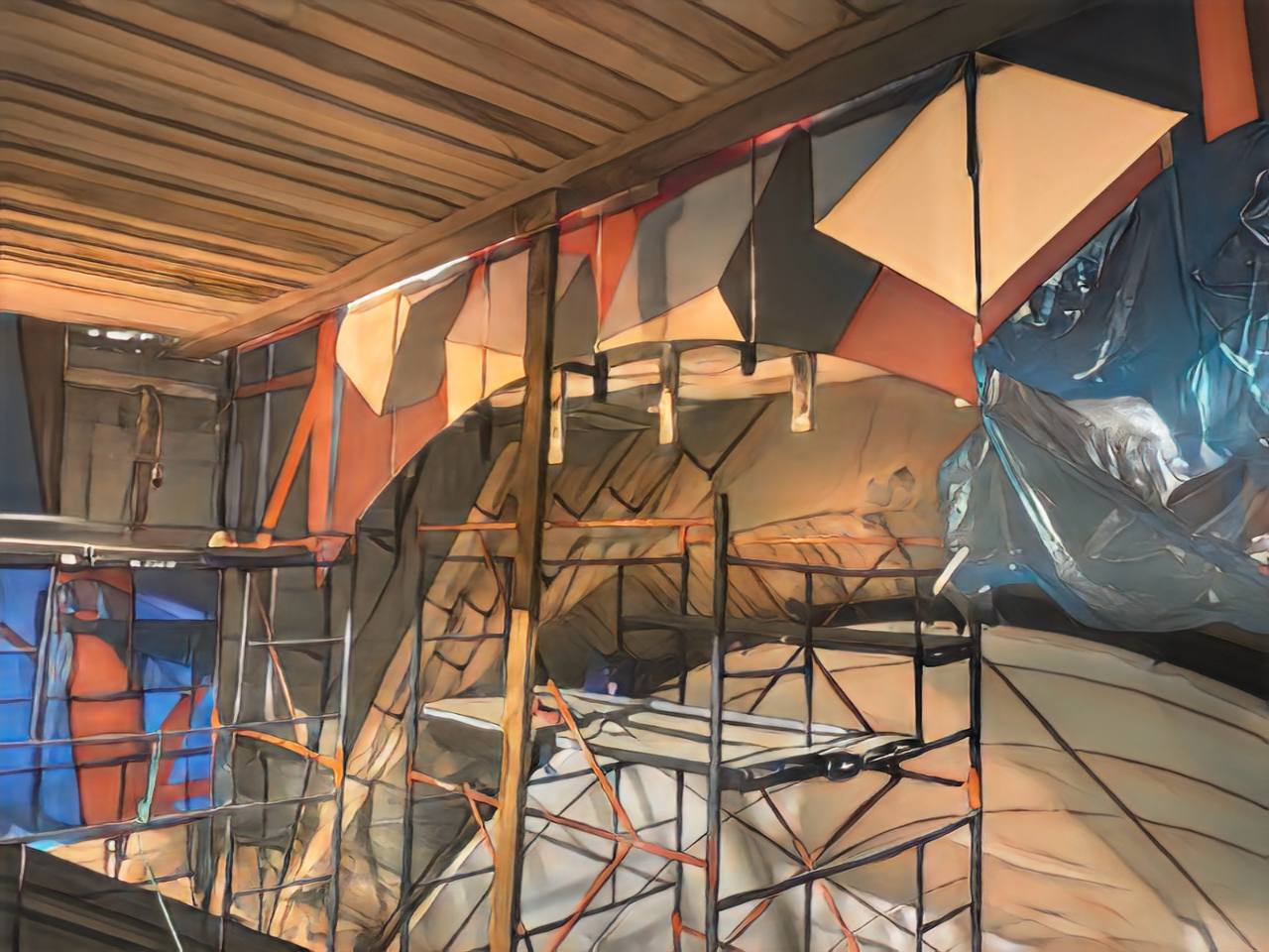 Одной из ключевых деталей интерьера станет это крупное панно над эскалаторами. Сначала специалисты смонтировали подсистему, а теперь на ней закреплены алюминиевые сотовые панели с иллюстрацией в стиле советского конструктивизма.