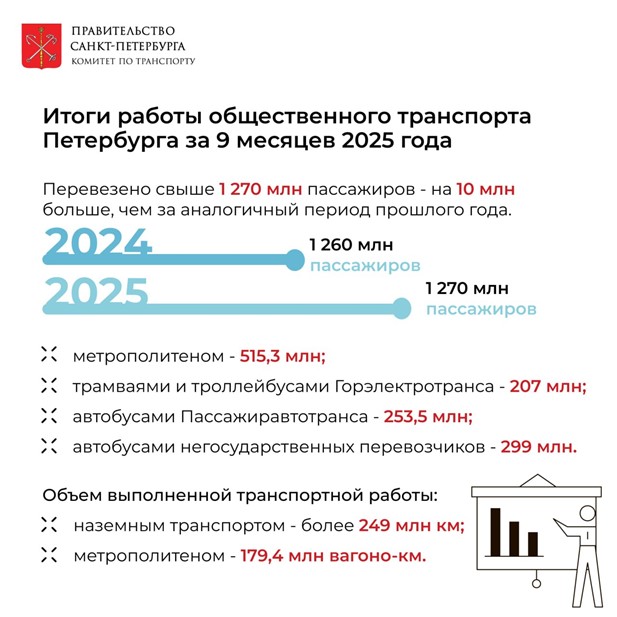 Пассажиропоток в петербургском транспорте с января по сентябрь 2025 года увеличился на 10 млн человек по сравнению с аналогичным периодом 2024-го года, рассказал вице-губернатор города Кирилл Поляков.