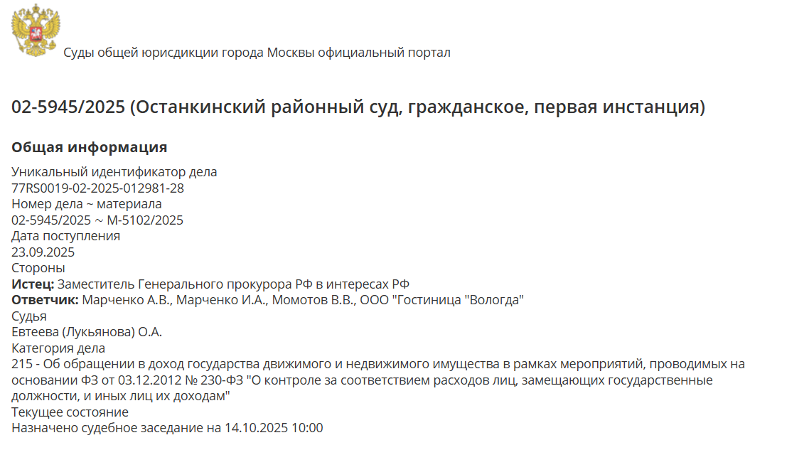 Ответчиками помимо Виктора Момотова и его соратника Андрея Марченко выступал его сын Иван и ООО "Гостиница "Вологда". Все изъятые объекты были в собственности доверенных лиц бывшего судьи. Речь идёт в том числе о сети гостиниц Marton из 40 учреждений в Москве, в Краснодарском крае, Ростовской, Воронежской областях и других российских регионах.
