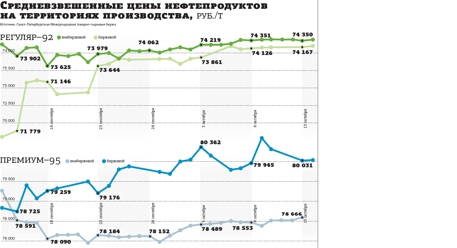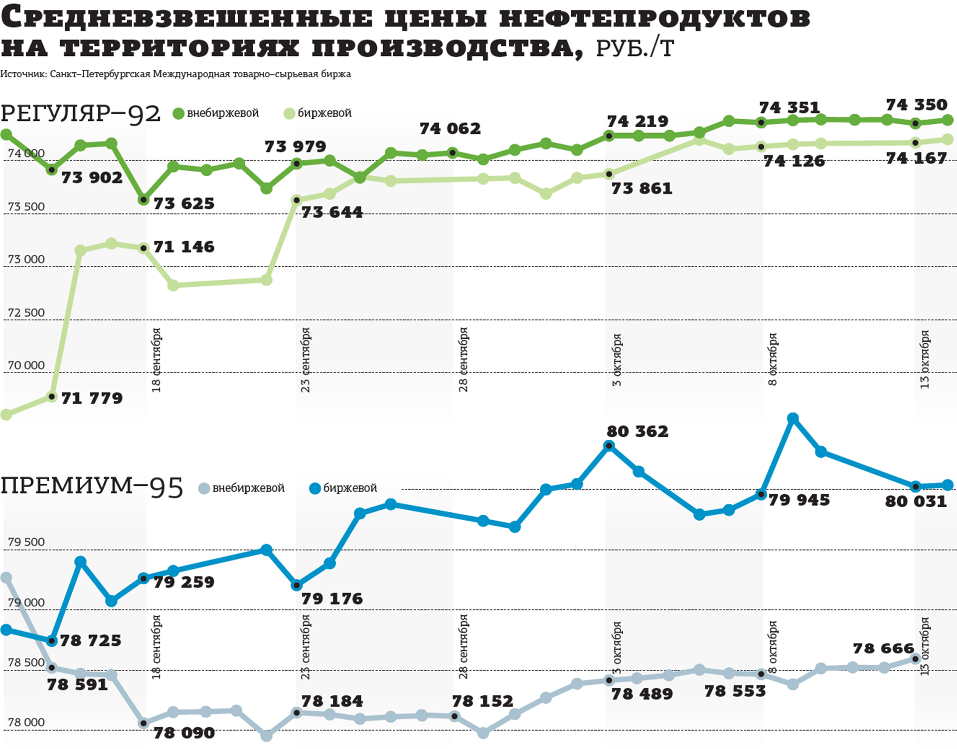 АИ–95 на этой неделе стоил более 80 тыс. рублей за тонну. Участники рынка говорят, что в начале сентября и в августе котировки АИ–95 достигали локальных максимумов свыше 82 тыс. рублей, но довольно быстро отскакивали назад.
