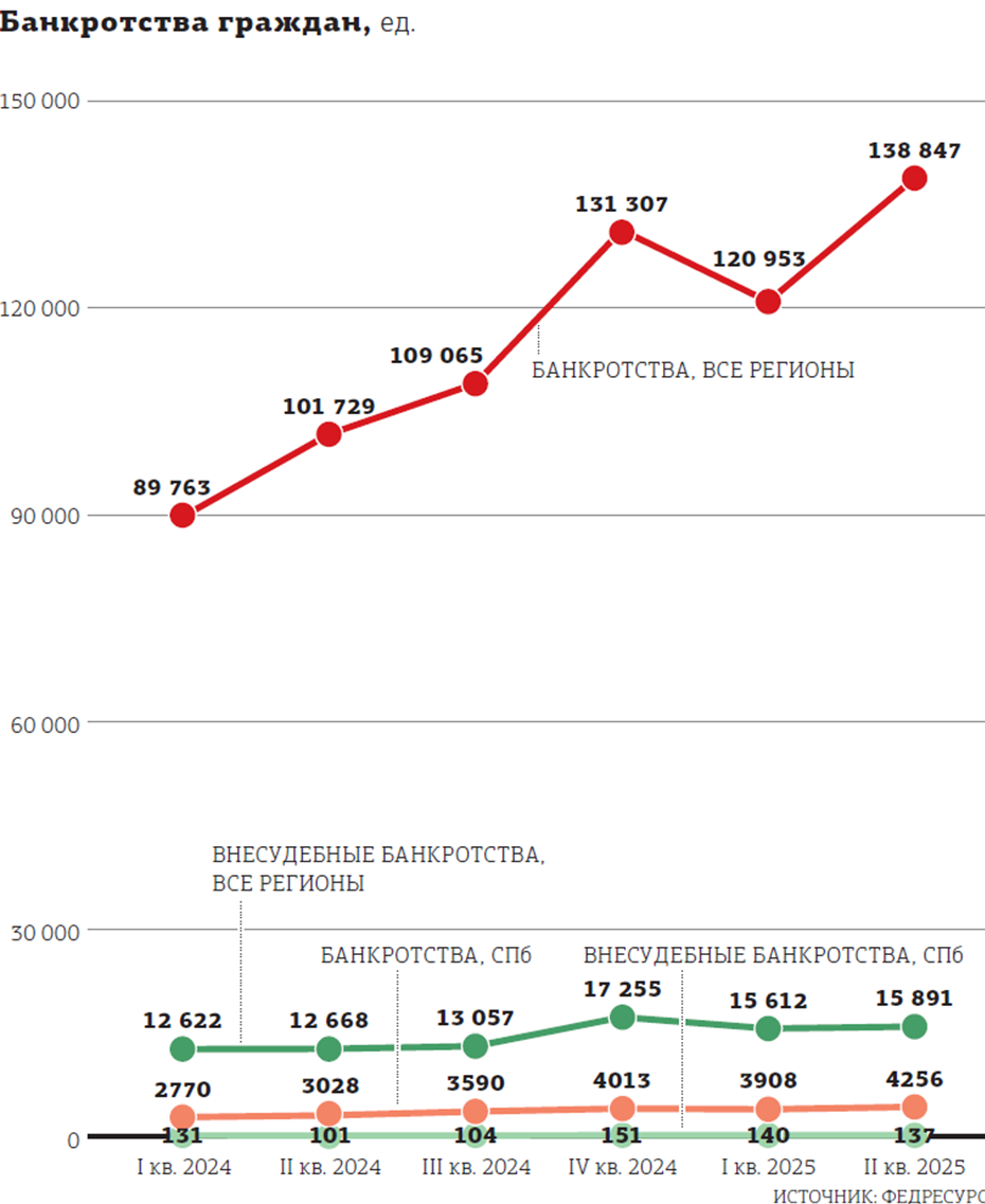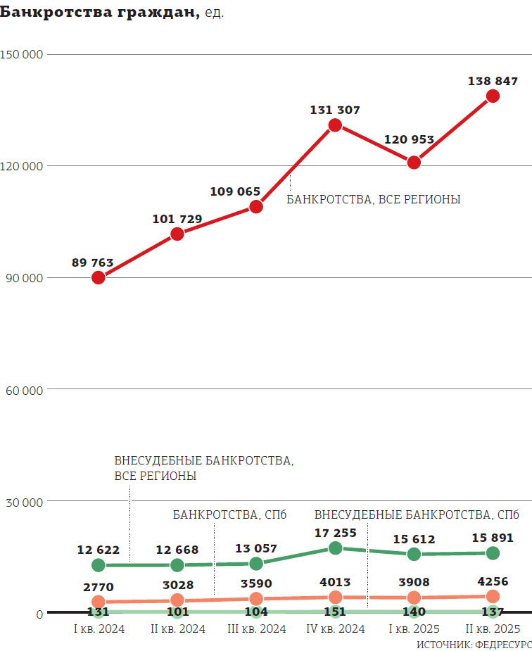 Иная причина, скорее всего, кроется в стремлении властей замедлить количественный рост банкротов и как–то попытаться защитить интересы банкиров. С момента появления института потребительского банкротства в 2015 году несостоятельными на сегодня стали почти 1,8 млн граждан. По данным Федресурса, в первом полугодии 2025 года число судебных банкротств физических лиц выросло на 36% к первой половине 2024 года, превысив 259 тыс. Количество внесудебных выросло на 25%, составив 31,5 тыс. Из 402 млрд рублей требований кредиторов в 2025 году удовлетворено лишь 27 млрд, или менее 7%.