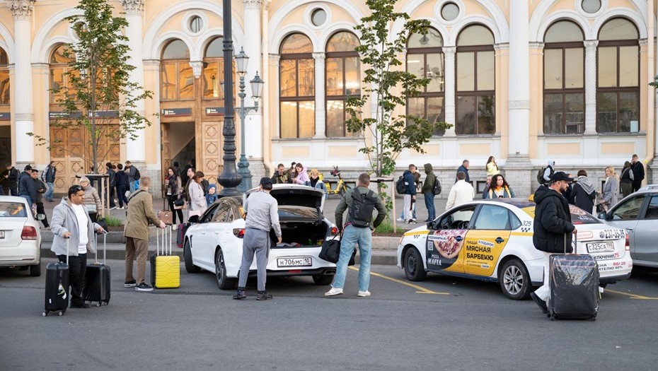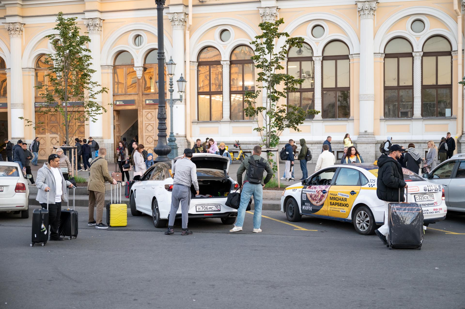 Путешественники, прибывшие на Московский вокзал, выходят из автомобилей такси и достают чемоданы из багажника. Прибывшие в Петербург загружаются в освободившиеся такси.