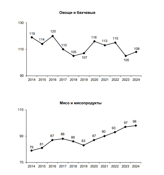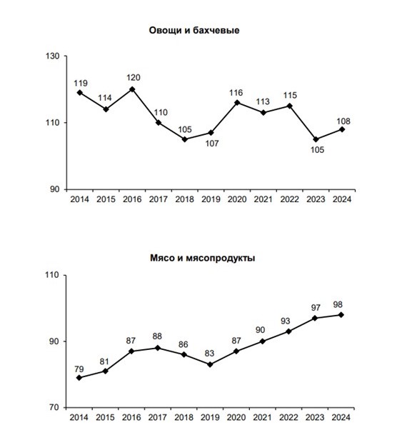 А вот потребление овощей с 2022 года сократилось к 2023-му на 10 кг, составив 105 кг на человека. Однако спустя год показатель вырос до 103 кг.