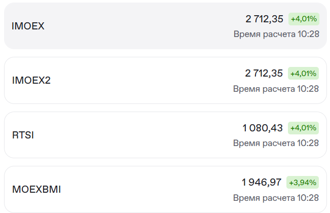 По итогам торгов индекс Мосбиржи (IMOEX2) доходил до отметки в 2716,58 пункта. В последний раз такие же результаты фиксировались в декабре 2024 года, после обнародования о ключевой ставке. Тогда Центробанк не стал изменять её, и индекс Мосбиржи вырос на 8,8%. В то же время, после первых телефонных переговоров Путина и Трампа 12 февраля 2025 года, рост достиг 5,78%.