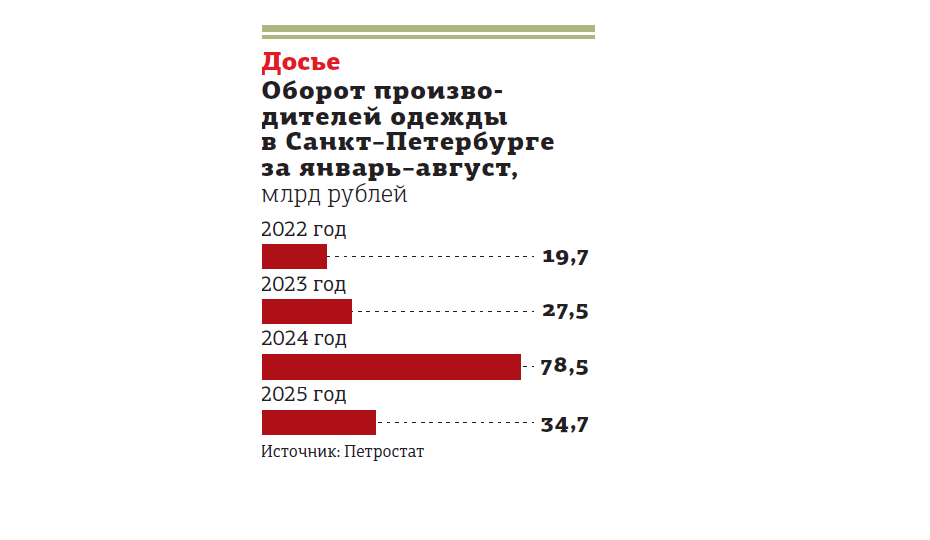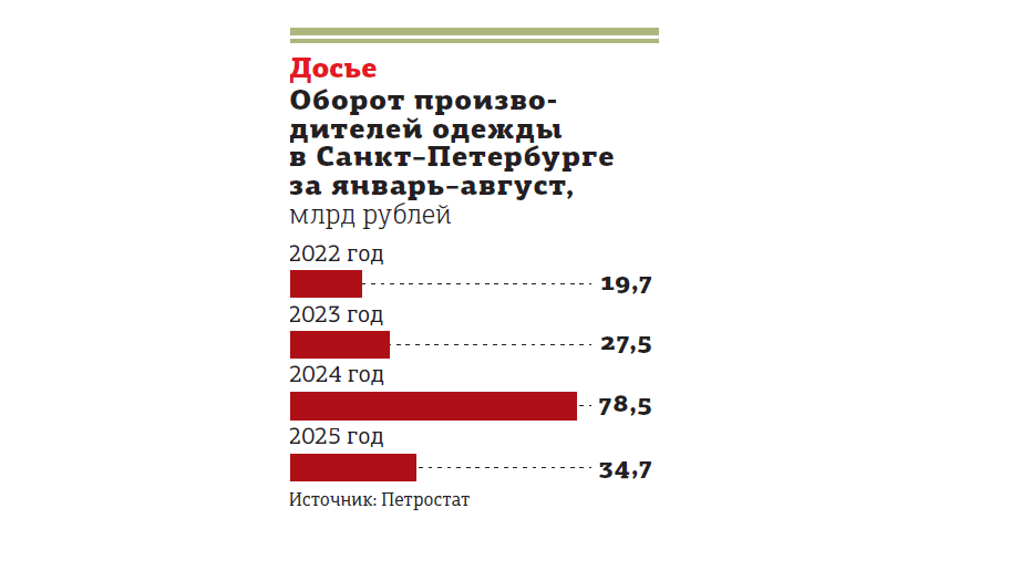 Оборот компаний, занимающихся производством одежды в Петербурге, за 8 месяцев 2025 года составил 34,7 млрд рублей, что на 55,7% меньше, чем за аналогичный период 2024 года. Такие данные приводит Петростат. В Ленинградской области, напротив, сумма выросла почти в 4,5 раза, хотя и осталась довольно скромной в натуральном выражении — 7,4 млрд.