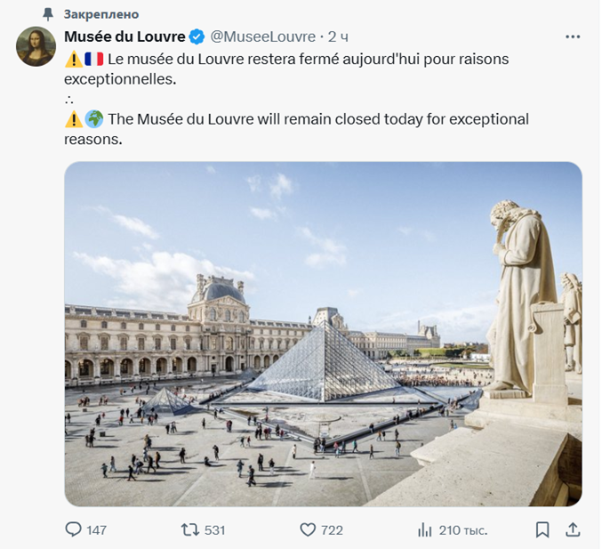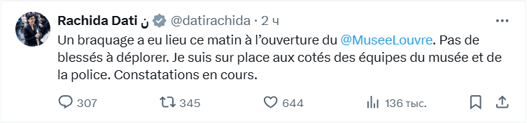 В соцсети Х глава Минкультуры Франции заявила, что ограбление произошло сегодня утром во время открытия музея.