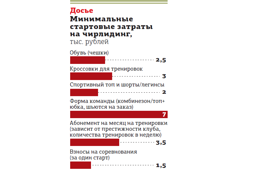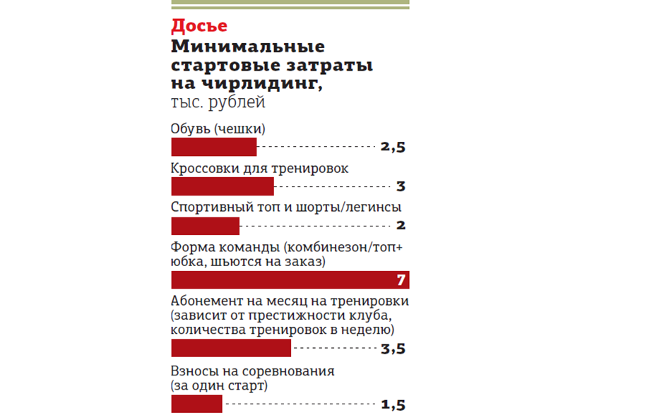 Из ежемесячных расходов надо ещё добавить стоимость абонемента на тренировки. Зависит от престижности клуба, количества тренировок в неделю (обычно две–четыре) и тренера. Например, группы для начинающих или детская обходятся от 3500 до 5 тыс. рублей в месяц. В профессиональной команде: от 6 тыс. до 10 тыс. В фитнес–клубах стандартный абонемент даёт доступ ко всем занятиям, включая чирлидинг.