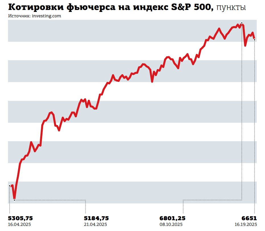 "Это не абстрактная проблема: рост доходностей казначейских облигаций увеличивает давление на бюджет и может вынудить ФРС пересмотреть свою политику, что подорвёт ликвидность на рынках, — объясняет он. — Второй по значимости риск — разочарование в ИИ, если компании–лидеры не смогут оправдать завышенные ожидания по прибылям в ближайших квартальных отчётах. Протекционизм Трампа — скорее катализатор, усугубляющий эти основные риски".
