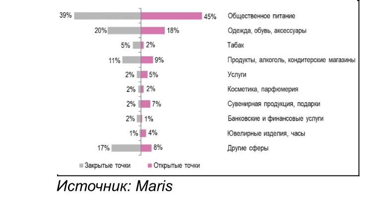 Также наблюдается рост доли таких сегментов, как сувенирные магазины и продуктовые — соответственно до 7% и 9%. В то же время сократилось число новых магазинов табачной продукции и банковских отделений.