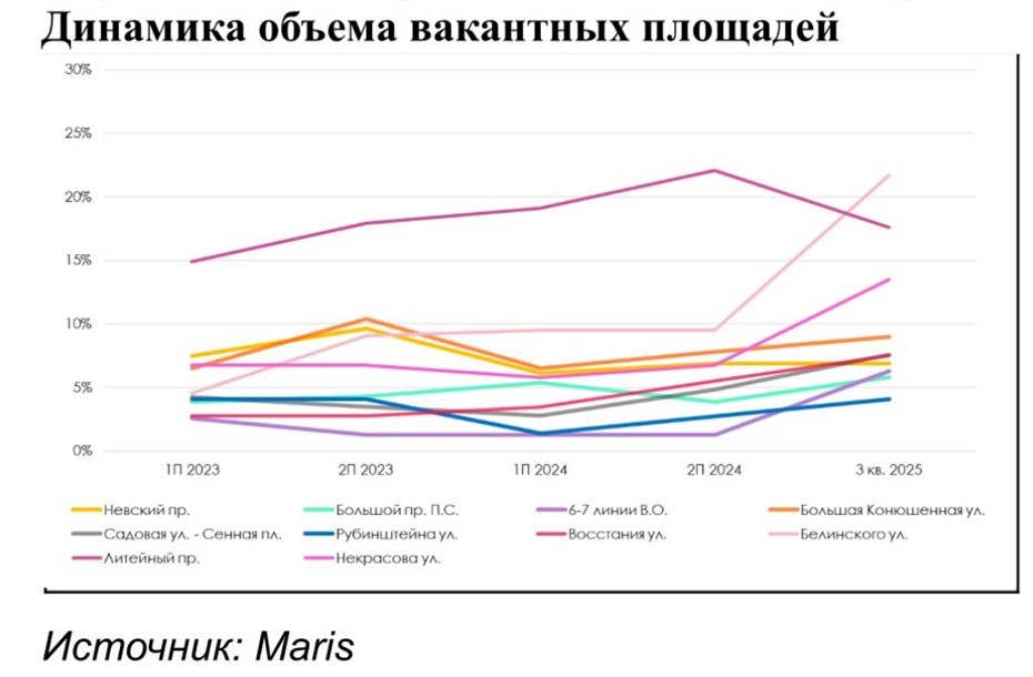 В среднем за год вакансия выросла на 2,7 п.п. — наибольший рост зафиксирован на улице Белинского (+13 п.п.), а снижение на Литейном проспекте (-4,4 п.п.) не повлияло на высокий общий уровень.