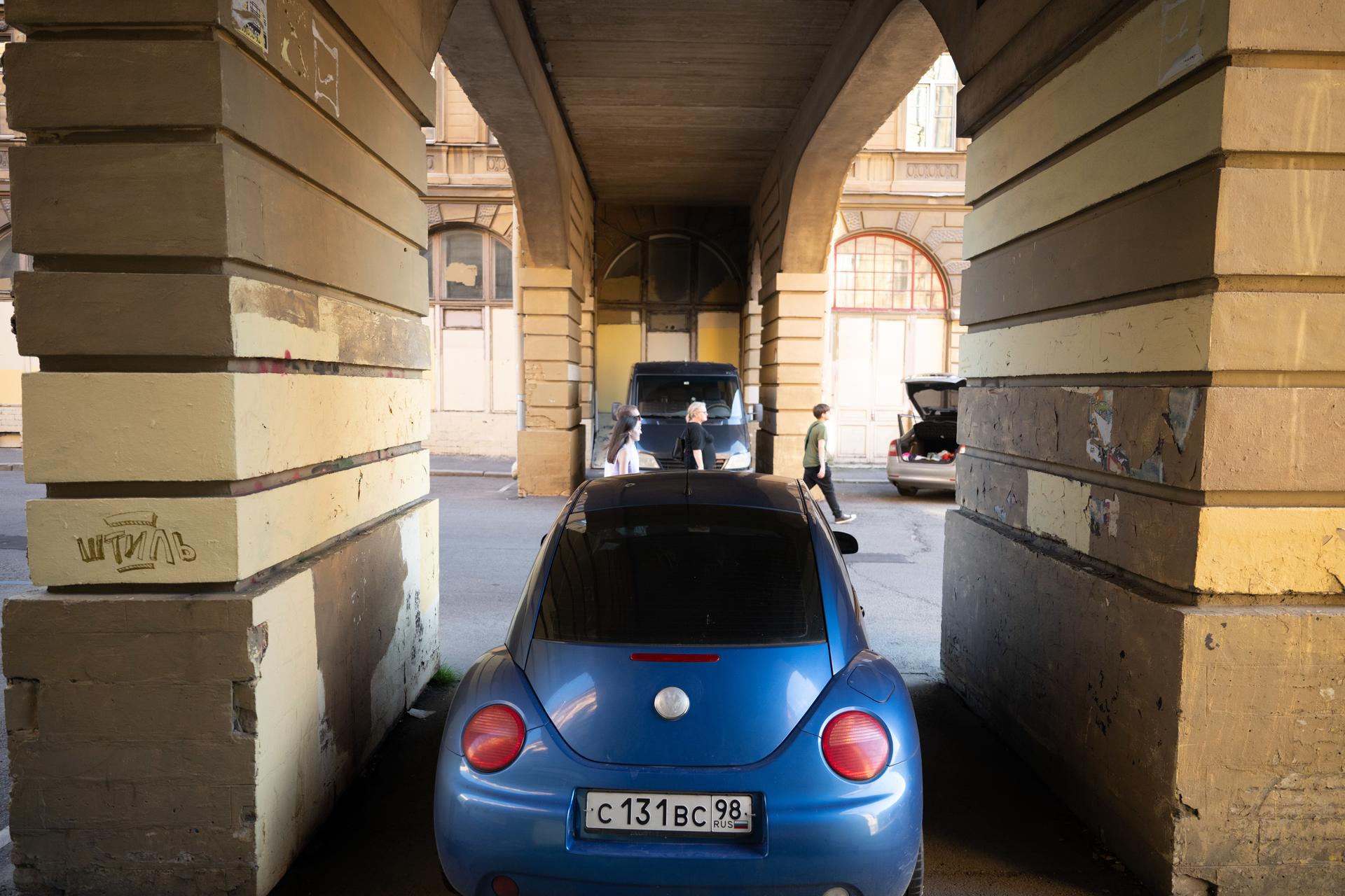 Авто запаркована между колон арки на Банковском переулке у набережной канала Грибоедова.